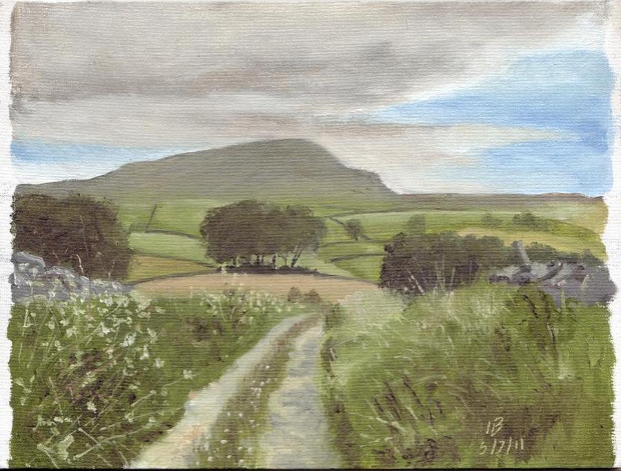 The 30th June was not a bad day to go off painting, not too hot and only a slight chance of rain, well, that's what I had thought before I set off. I had always wanted to picture Brant's ghyll resurgence ever since I had first seen it, but because it is what it is, a small cave and a spring at the foot of a small limestone cliff, it is therefore a fairly boring subject matter, the difficulty here was to at least attempt to make it interesting, a feat of which I have to admit I have failed. I have visited Brant's Ghyll on a number of times in conditions as varied as snow to searing heat, but whatever the condition, it would seem that the light never affects this place. I find the site of huge interest as a geologist, a natural spring at the foot of a massive limestone block, at the junction where the limestone meets the more impermeable slates and flagstones of the Horton group of rocks, and as water cannot pass through, makes an exit along this spring line. The reservoir for this water is deep under the Pen-y-ghent massif, in the speilogically-elusive master cave. I heard a story that at one point for a long time this spring never flowed, and this was a dry valley, but during one deluge, something changed in the internal organs of the cave system, and Brant's ghyll flowed again. It is a place of solitude, not many people know about it and is often overlooked as people tend to bypass it on their way up the well-worn tracks along the pennine way or up pen-y-ghent.